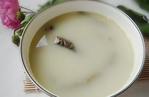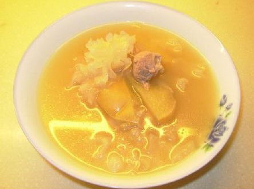 3、做法:起锅略煎鱼骨,红萝卜去皮切片略微爆炒,然后加水,滚十分钟后换落汤煲去煲,加黄豆和雪耳。汤直接饮用,或用来煮面煮粥。